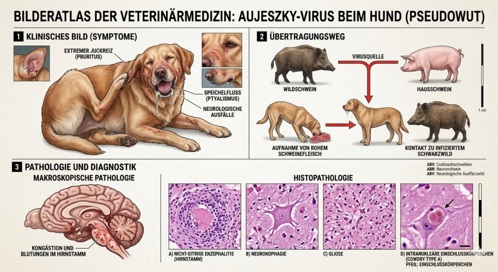 Darüber werden Hirnstamm und Hirnnervenkerne infiziert. Durch die Vermehrung des Virus im Gehirn wird eine Enzephalomyelitis verursacht, bei der sich das Gehirn entzündet. Die Myelinschicht, die die Nerven umgibt, wird zerstört. Das Hirngewebe weist eine Vielzahl von kleinen Löchern auf, ähnlich dem durch Motten verursachten Lochfraß in Kleidung. Das Myelin ist eine Fettschicht, die die Nervenfasern umhüllt, wie vergleichsweise die Isolierschicht eines Elektrokabels. Durch das Fehlen kommt es zum Überspringen von Nervenimpulsen. Wenn Hunde das Virus aufnehmen, dauert es ca. zwei Tage bis die Aujeszkysche Krankheit ausbricht. Die Tiere bekommen eine Gehirn- und Rückenmarksentzündung, an der sie innerhalb von wenigen Tagen sterben. Zu Beginn ähneln die Symptome denen der Tollwut, weswegen Aujeszky auch als „Pseudowut“ bekannt ist. Appetitlosigkeit, Mattigkeit Erregung, Bellen oder Winseln zählen zu den ersten Symptomen nach der Inkubationszeit von ein bis fünf Tagen. Atemnot, Schluckbeschwerden, verstärkte Speichelproduktion und Erbrechen prägen den weiteren Krankheitsverlauf. Am auffälligsten ist aber der intensive Juckreiz, der an Fang und Behängen beginnt und häufig bis zur Selbstverstümmelung führt. Im weiteren Verlauf kommt es zu Bewusstseinstrübungen, Krämpfen und Lähmungen. Letztlich werden die betroffenen Hunde ruhig, verlieren das Bewusstsein und sterben. Eine Behandlungsmöglichkeit oder einen Impfstoff gibt es nicht.