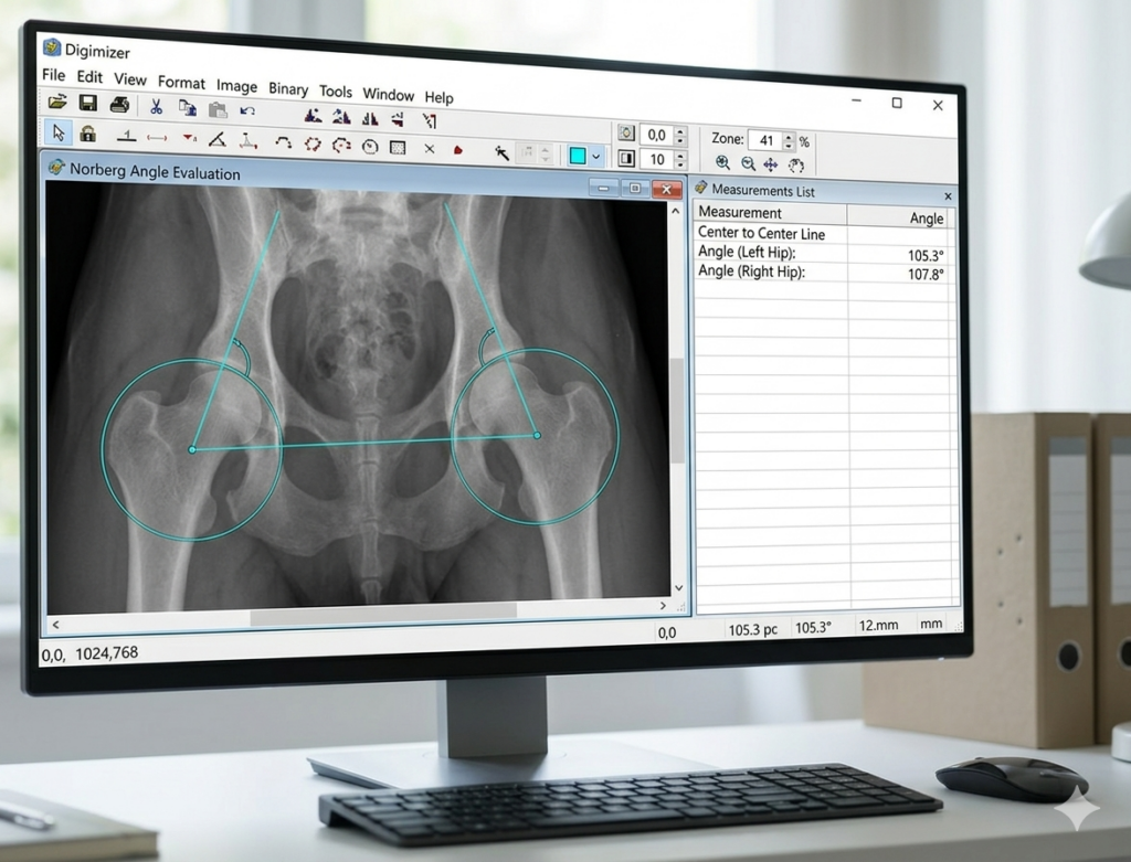 Ein wesentliches Auswertungskriterium ist der Norberg-Winkel. Er ist als der Winkel definiert, der zwischen der Verbindungslinie der Zentren der beiden Oberschenkelköpfe und dem vorderen Pfannenrand abgetragen wird (siehe Abbildung). Bei einem HD-freien Tier sollte er mehr als 105° betragen. Weitere Beurteilungskriterien sind die Kongruenz (Übereinstimmung) von Oberschenkelkopf und Gelenkpfanne, die Weite des Gelenkspaltes, die Pfannenkontur, die Kontur des Oberschenkelkopfes sowie das Vorhandensein von Hinweisen auf arthrotische Prozesse wie walzenförmige Verdickungen des Oberschenkelhalses, Randwülste an der Gelenkpfanne, unter dem Knorpel befindliche Verdichtungen der Knochensubstanz im Pfannenbereich und die Anlagerung von Knochenmaterial am Ansatz der Gelenkkapsel der sogenannten Morgan-Linie.