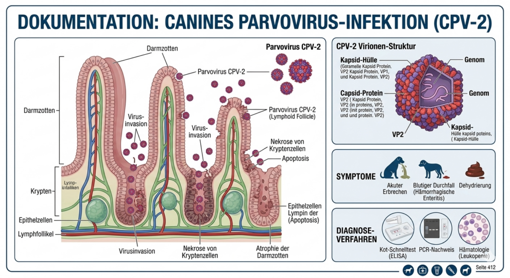 Die Parvovirose des Hundes wurde im Jahr 1978 fast gleichzeitig in Europa, Nordamerika und Australien entdeckt. Der Erreger, das Parvo-Virus, wird von erkrankten Tieren massenhaft mit dem Kot ausgeschieden und ist in der Außenwelt sehr lange lebensfähig. Typische Ansteckungsquellen sind mit Kot beschmutztes Futter, Gegenstände und Kleider. Das Parvo-Virus wird über den Mund aufgenommen und siedelt sich in der Dünndarmschleimhaut an.