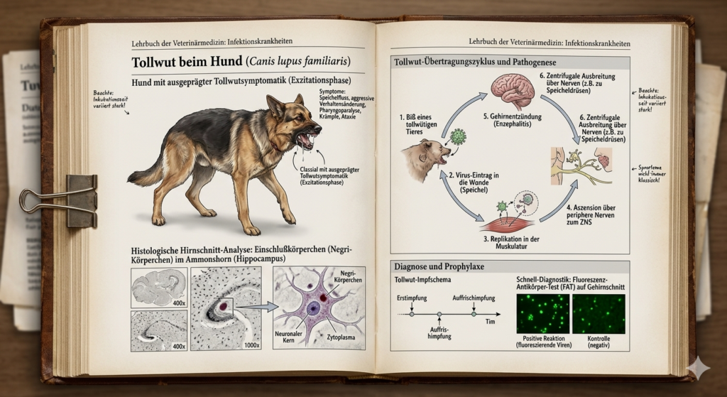 Erst nach Wochen und Monaten nach der Ansteckung kann es zu klinischen Symptomen kommen, die mit Juckreiz, Speichelfluss, Unruhe und Beißwut auf Tollwut hinweisen können.