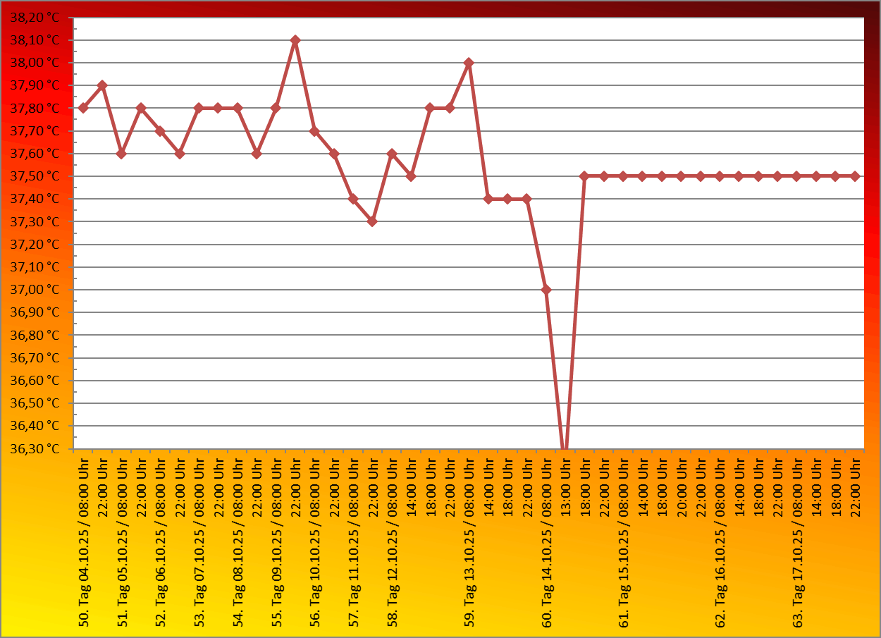 | Fr, 03.10.2025 | Ab morgen messen wir 2x täglich die Körpertemperatur. Während der Trächtigkeit beträgt die Körperinnentemperatur der Hündin ca. 38,0 – 38,5 Grad Celsius. Gegen Ende der Trächtigkeit ( 8 – 10 Tage vor der Geburt ) sinkt, ebenso wie der Progesteronspiegel, auch die Temperatur auf zunächst 37,5 Grad ab.